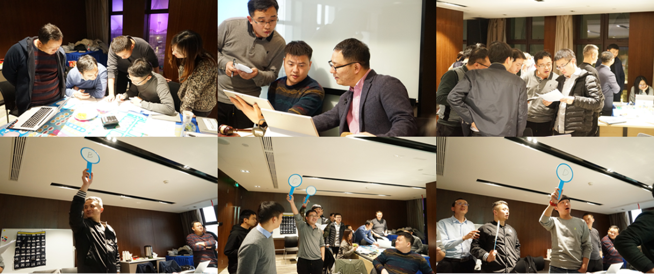 培訓(xùn)開始,全體學(xué)員以小組為單位,成立了ABCDE五個(gè)公司,并分別選出各公司的“總經(jīng)理”、“成本總”、“財(cái)務(wù)總“、“投資總”、“運(yùn)營(yíng)總”、“營(yíng)銷總”。傅威講師針對(duì)沙盤模擬的規(guī)則、沙盤盤面各標(biāo)識(shí)的含義、人員分工與角色職責(zé)進(jìn)行了講解,并說明了經(jīng)營(yíng)業(yè)績(jī)的考核標(biāo)準(zhǔn)。在沙盤模擬正式開始前,為調(diào)動(dòng)學(xué)員積極性,營(yíng)造市場(chǎng)競(jìng)爭(zhēng)氛圍,每個(gè)公司交納了800元的集資獎(jiǎng)金,最后會(huì)視公司經(jīng)營(yíng)情況進(jìn)行獎(jiǎng)金分配。隨后,在傅講師的指導(dǎo)下,大家進(jìn)入為期一年的項(xiàng)目模擬經(jīng)營(yíng)演練環(huán)節(jié),初步了解了房地產(chǎn)開發(fā)全流程的內(nèi)容和操作手法。