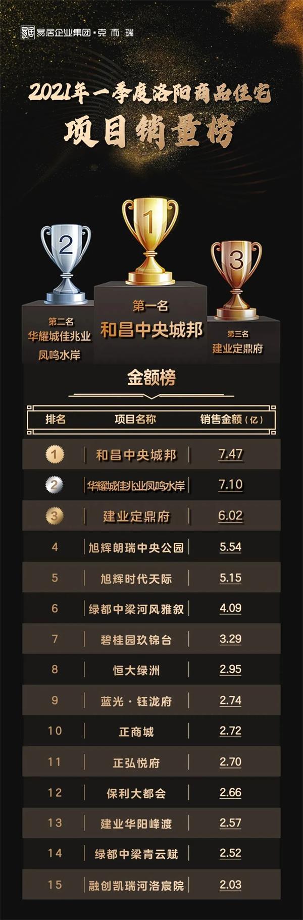 近日,克而瑞河南區(qū)域發(fā)布洛陽樓市一季度榜單。數(shù)據(jù)顯示,和昌洛陽中央城邦項目以7.47億元的業(yè)績,榮摘洛陽2021年一季度商品住宅銷量金額榜桂冠。